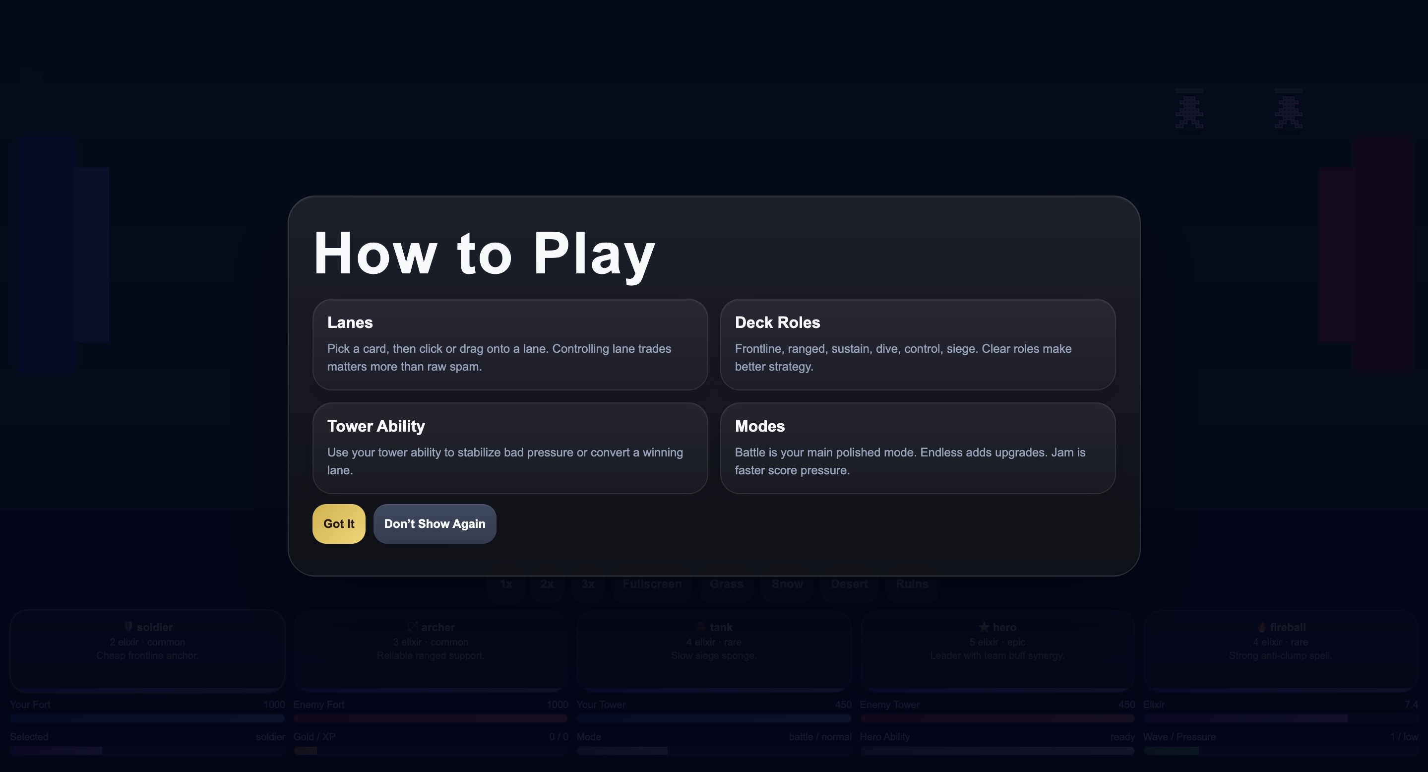 Build a focused deck, deploy units across three lanes, defend your tower, and break through enemy pressure before the realm overwhelms you. Each card has a clear role, from sturdy frontliners and ranged supports to assassins, siege units, control casters, and sustain tools. Winning is about timing, lane control, and smart elixir use, not blind spam.